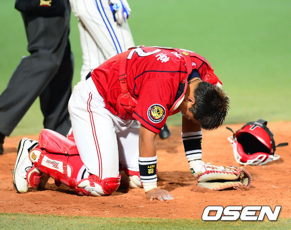 29일 오후 대구 시민운동장에서 열린 2013 한국야쿠르트 세븐프로야구 삼성 라이온즈와 KIA 타이거즈의 경기, 8회말 2사 삼성 김상수의 파울타구에 맞은 KIA 김상훈 포수가 고통스러워하고 있다.