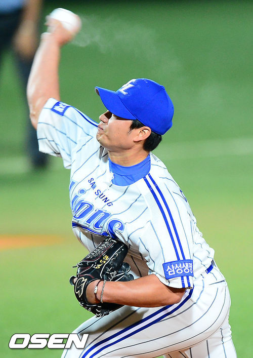 29일 오후 대구 시민운동장에서 열린 2013 한국야쿠르트 세븐프로야구 삼성 라이온즈와 KIA 타이거즈의 경기, 9회초 마운드에 오른 삼성 오승환이 힘차게 공을 뿌리고 있다.