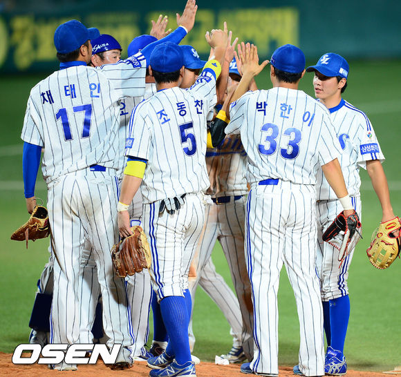 경기를 마치고 삼성 선수들이 마운드 근처에서 하이파이브를 하고 있다. / rumi@osen.co.kr