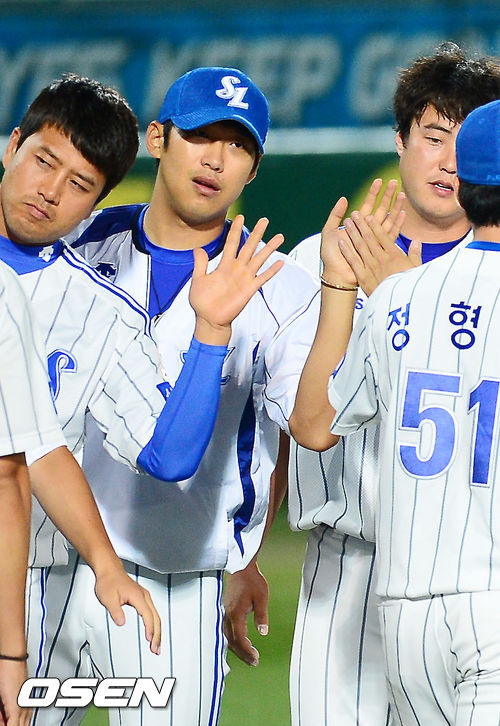 경기를 마치고 삼성 윤성환이 동료들과 하이파이브를 하고 있다. / rumi@osen.co.kr