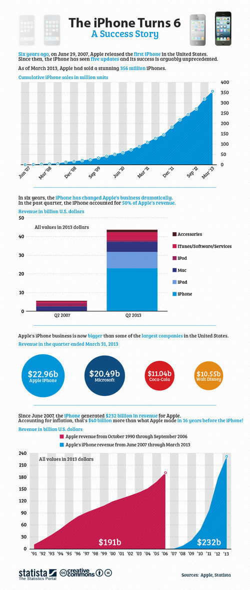 스테이티스타는 애플의 ‘아이폰’ 도입 6주년을 기념해 ‘아이폰’ 출시로 인해 애플에 어떤 변화가 생겼는지, 지금까지 총 몇 대의 ‘아이폰’ 시리즈가 판매됐는지 등에 관해 통계 결과를 공개했다. 통계치는 가독성을 위해 문자가 아닌 그래프로 작성됐다.
