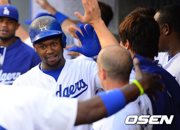 [OSEN=로스앤젤레스, 곽영래 기자] 30일(한국시간) 미국 캘리포니아주 로스앤젤레스 다저 스타디움에서 열린 2013 미국 메이저리그 LA 다저스와 필라델피아 필리스의 경기, 1회말 1사 1,2루서 스리런 홈런을 친 라미레스를 류현진이 반갑게 맞이하고 있다.