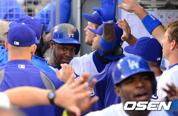 [OSEN=로스앤젤레스, 곽영래 기자] 30일(한국시간) 미국 캘리포니아주 로스앤젤레스 다저 스타디움에서 열린 2013 미국 메이저리그 LA 다저스와 필라델피아 필리스의 경기, 1회말 1사 1,2루서 스리런 홈런을 친 라미레스를 류현진이 반갑게 맞이하고 있다.