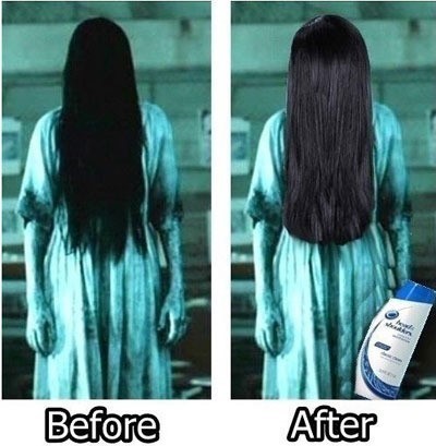 이 광고 사진에는 공포영화 '링'에 나오는 귀신 사다코가 등장한다. 귀신의 트레이드 마크인 풀어헤친 긴 머리를 늘어뜨린 사다코는 거칠고 결이 좋지 않은 샴푸 사용 전 사진과, 부드럽고 윤이 나는 머리결로 변한 샴푸 사용 후 사진으로 나뉘어 있다. 어설픈 합성 사진이지만 섬찟한 기분과 웃음을 동시에 이끌어내는 사진이기도 하다.