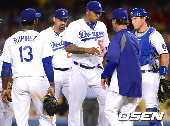 [OSEN=로스앤젤레스, 곽영래 기자] 30일(한국시간) 미국 캘리포니아주 로스앤젤레스 다저 스타디움에서 열린 2013 미국 메이저리그 LA 다저스와 필라델피아 필리스의 경기, 8회초 2사 만루 매팅리 감독이 마운드에 올라 벨리사리오를 강판 시키고 있다.