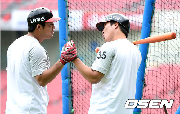 30일 오후 서울 잠실야구장에서 열리는 '2013 한국야쿠르트 세븐 프로야구' LG 트윈스와 SK 와이번스의 경기, LG 정의윤과 이진영이 로이킴의 '봄봄봄' 노래에 휘파람을 불며 장난을 치고 있다.