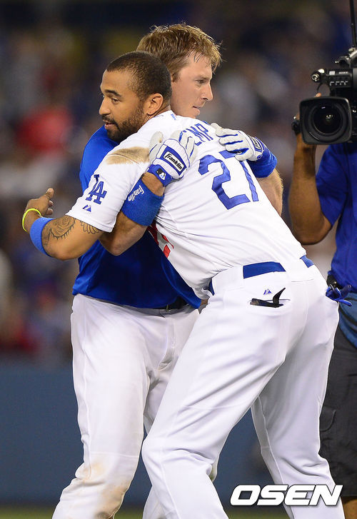 경기종료 후 맷 켐프와 끝내기 안타를 날린 엘리스가 포옹을 하고 있다./ soul1014@osen.co.kr