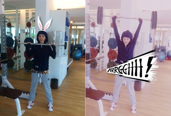 산다라박은 30일 오후 자신의 트위터에 "우리의 자랑스런 싼미란 선수! 1단계 성공! 싱가폴에서도 고독한 자기관리 중. 역기를 들었다 놨다"는 글과 함께 사진 2장을 공개했다.