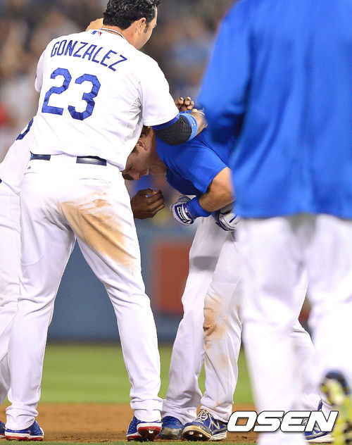 경기종료 후 끝내기 안타를 날린 A.J.엘리스가 동료들의 축하를 받고 있다. / soul1014@osen.co.kr
