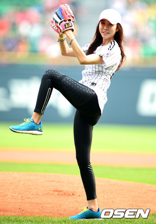 30일 오후 서울 잠실야구장에서 열린 '2013 한국야쿠르트 세븐 프로야구' LG 트윈스와 SK 와이번스의 경기, 경기에 앞서 배우 한은정이 시구를 하고 있다.