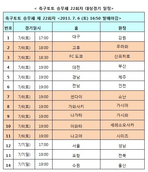 [축구토토] 국민체육진흥공단(www.kspo.or.kr)이 발행하는 체육진흥투표권 수탁사업자인 스포츠토토(www.sportstoto.co.kr)는 내달 6,7일 이틀간 벌어지는 K리그 클래식 7경기 및 일본프로축구(J리그) 7경기 등 총 14경기를 대상으로 한 축구토토 승무패 22회차 게임을 발행한다고 밝혔다.