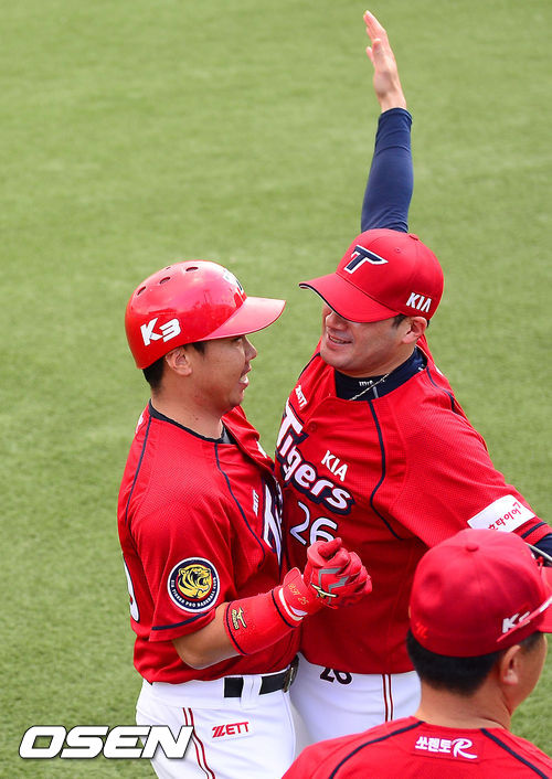 30일 오후 대구 시민운동장에서 열린 2013 한국야쿠르트 세븐프로야구 삼성 라이온즈와 KIA 타이거즈의 경기, 2회초 1사 주자 없는 상황에서 KIA 이범호가 좌중월 동점 솔로홈런을 날린 후 덕아웃에서 서재응과 포옹을 하고 있다.