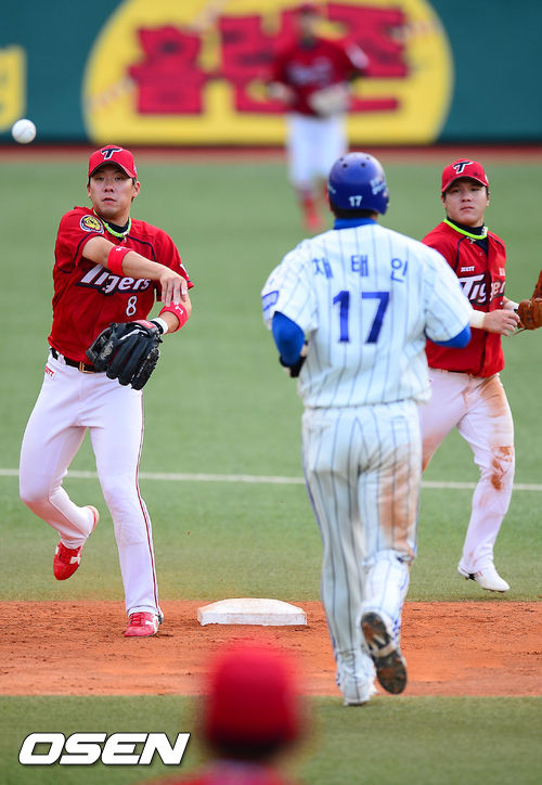 30일 오후 대구 시민운동장에서 열린 2013 한국야쿠르트 세븐프로야구 삼성 라이온즈와 KIA 타이거즈의 경기, 3회말 1사 주자 1루 삼성 조동찬의 유격수 병살타때 KIA 2루수 안치홍이 2루에서 채태인을 포스아웃 시킨 후 1루로 송구하고 있다.