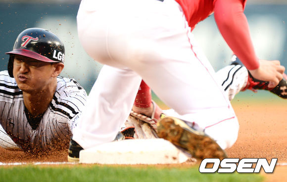 30일 오후 서울 잠실야구장에서 열린 '2013 한국야쿠르트 세븐 프로야구' LG 트윈스와 SK 와이번스의 경기, 6회말 무사 1,2루에서 LG 2루주자 박용택이 3루 도루를 시도했지만 SK 최정에 태그아웃당하고 있다.