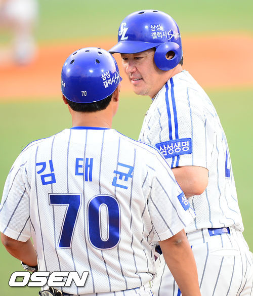 30일 오후 대구 시민운동장에서 열린 2013 한국야쿠르트 세븐프로야구 삼성 라이온즈와 KIA 타이거즈의 경기, 5회말 무사 주자 만루에 삼성 진갑용이 중견수 앞 1타점 적시타를 날린 후 1루에서 김태균 코치와 하이파이브를 하고 있다.