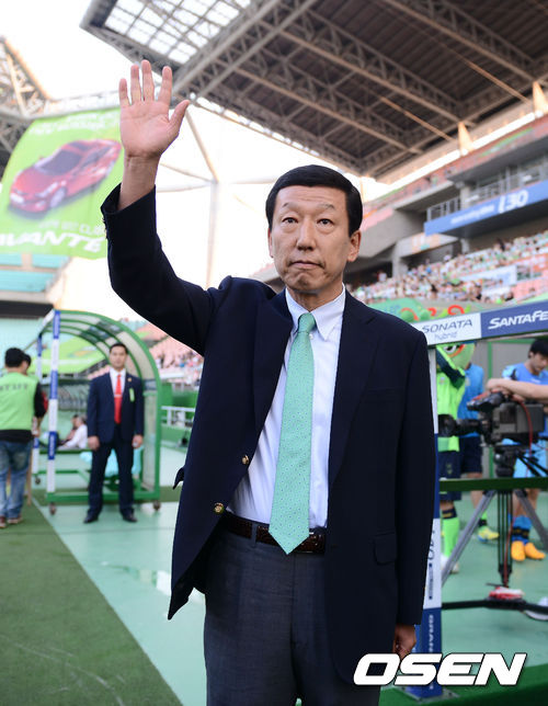 30일 오후 전주월드컵경기장에서 '2013 현대오일뱅크 K리그 클래식' 15라운드 전북 현대와 경남 FC 경기가 열렸다. 전북 현대 감독으로 복귀한 '봉동이장' 최강희 감독이 팬들에게 손을 들어 인사하고 있다.
