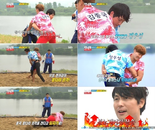이날 정우성은 '런닝맨'의 능력자 김종국과 씨름대결을 펼쳤다. 팽팽한 신경전을 벌이던 정우성은 김종국에게 밭다리 공격을 하며 승부수를 띄웠지만 김종국이 되치기로 정우성을 쓰러트렸다.