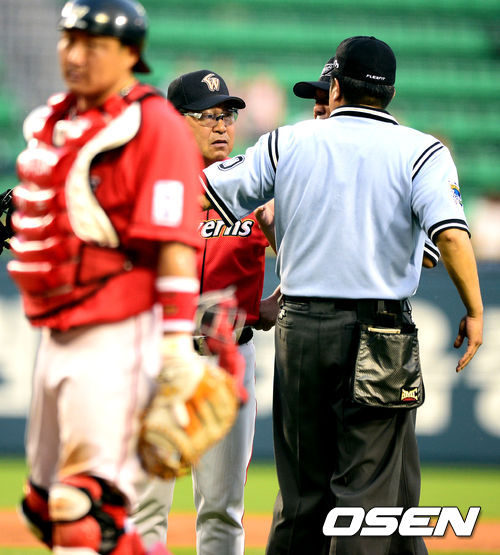30일 오후 서울 잠실야구장에서 열린 '2013 한국야쿠르트 세븐 프로야구' LG 트윈스와 SK 와이번스의 경기, 7회말 2사 2루에서 SK 이만수 감독이 마운드에 올라 레이예스와 이야기를 나누고 내려오다 윤상원 구심에게 불만을 나타내고 있다.