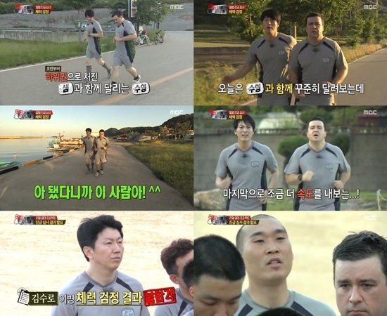 특히 마지막 체력검정인 ‘3km 달리기’에서 류수영 등은 진한 전우애를 보여줬다. ‘샘바라기’인 류수영은 뜀걸음 때면 열외전력이었던 샘을 위해 천천히 함께 달렸고 김수로와 서경석은 갈비뼈 부상을 당한 손진영을 부축해가며 뛰었다. 천천히 달렸기에 기록은 최하위에 머물러 불합격됐다.