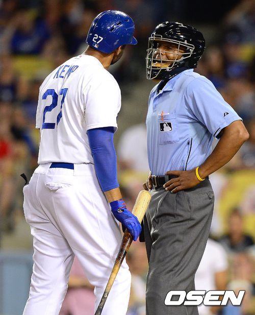 9회말 1사 1루 맷 켐프가 루킹 삼진을 당한 후 구심에게 항의하고 있다. / soul1014@osen.co.kr