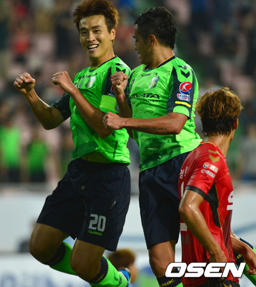 30일 오후 전주월드컵경기장에서 '2013 현대오일뱅크 K리그 클래식' 15라운드 전북 현대와 경남 FC 경기가 열렸다. 후반 전북 이동국이 팀의 네번째 골이자 자신의 두 번째 골을 넣은 뒤 에닝요와 기쁨의 세레모니를 펼치고 있다.