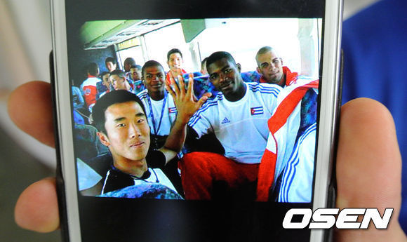 삼성 김상수가 공개해 화제를 모은 2008년 세계청소년대회 우승할 때 쿠바 특급 푸이그와 함께 찍은 사진. 두산 허경민이 푸이그와 손바닥을 맞대고 있다.