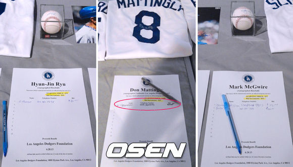 흥미로운 것은 마크 맥과이어 타격코치의 사인볼이다. 류현진보다 높은 100달러(약 11만원)까지 입찰가가 적혀있다. 세인트루이스 카디널스 프랜차이즈 스타인 맥과이어가 처음 다저스에 왔을 때 팬들은 냉담한 반응을 보였다고 한다. 현역시절 다저스 투수들을 신나게 두들겼던 타자에다가 금지약물 복용까지 고백했기 때문이다.