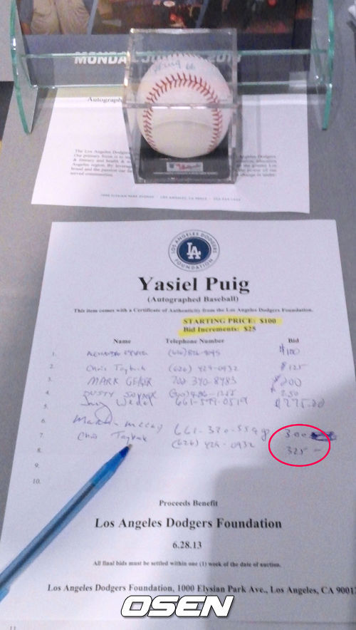일단 류현진의 사인볼은 딱 한 명이 구매의사를 드러냈다. 시작가 75달러가 종이에 적혀 있는데 이름을 보면 한국인이 아닌 것을 확인할 수 있다. 경매에 나온 많은 물건들이 입찰 개시도 하지 못한 가운데 류현진은 일단 현지 팬에게 선택을 받는데는 성공했다. 올 시즌 류현진은 다저스 2선발로 자리 잡으면서 팬들의 사랑을 듬뿍 받고 있다. 류현진이 선발로 등판했던 30일에는 다저스타디움에 52000여명의 관중이 찾기도 했다.
