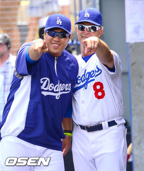 [OSEN=로스앤젤레스, 곽영래 기자] 1일(한국시간) 미국 캘리포니아주 로스앤젤레스 다저 스타디움에서 열린 2013 미국 메이저리그 LA 다저스와 필라델피아 필리스의 경기에 앞서 류현진과 매팅리 감독이 카메라를 향해 포즈 취하고 있다