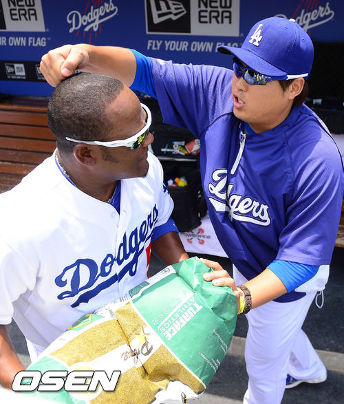 [OSEN=로스앤젤레스, 곽영래 기자] 1일(한국시간) 미국 캘리포니아주 로스앤젤레스 다저 스타디움에서 열린 2013 미국 메이저리그 LA 다저스와 필라델피아 필리스의 경기에 앞서 류현진과 우리베가 장난을 치고 있다