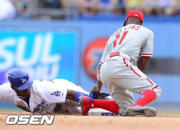 [OSEN=로스앤젤레스, 곽영래 기자] 1일(한국시간) 미국 캘리포니아주 로스앤젤레스 다저 스타디움에서 열린 2013 미국 메이저리그 LA 다저스와 필라델피아 필리스의 경기, 4회말 무사 다저스 곤살레스의 타석때 1루 주자 푸이그가 도루 성공하고 있다
