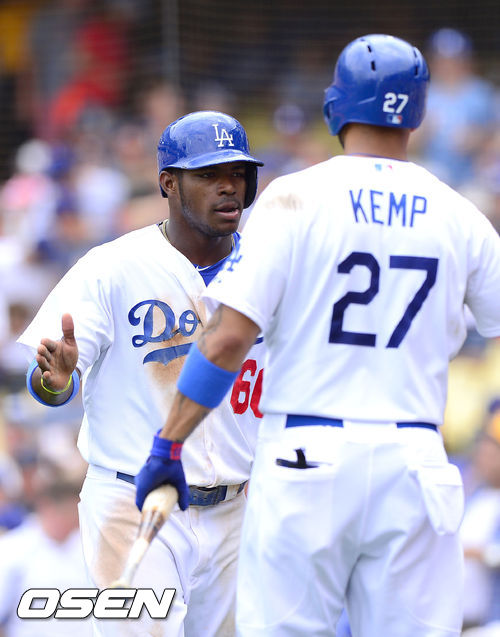 [OSEN=로스앤젤레스, 곽영래 기자] 1일(한국시간) 미국 캘리포니아주 로스앤젤레스 다저 스타디움에서 열린 2013 미국 메이저리그 LA 다저스와 필라델피아 필리스의 경기, 4회말 1사 2루 다저스 라미레스의 선취 1타점 적시타때 2루 주자 푸이그가 홈을 밟은 후 맷 켐프와 하이파이브를 하고 있다.