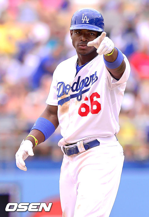 [OSEN=로스앤젤레스, 곽영래 기자] 1일(한국시간) 미국 캘리포니아주 로스앤젤레스 다저 스타디움에서 열린 2013 미국 메이저리그 LA 다저스와 필라델피아 필리스의 경기 7회말 다저스 선두타자 푸이그가 2루타를 날리고 환호하고 있다. 푸이그는 4타수 4안타 사이클링 히트에 홈런을 하나 남겨두게 됐다.