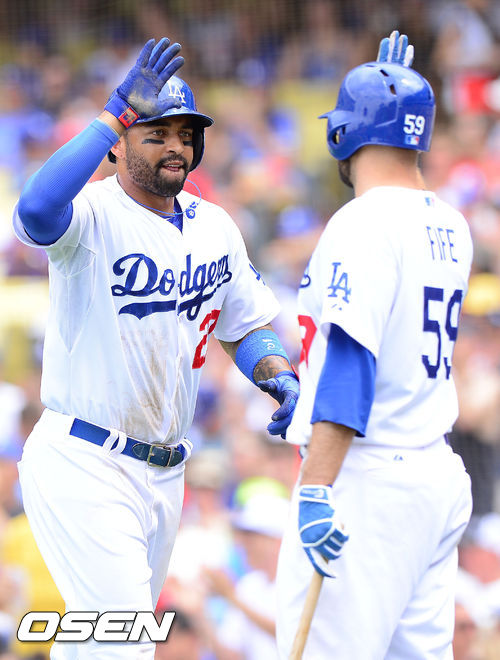 [OSEN=로스앤젤레스, 곽영래 기자] 1일(한국시간) 미국 캘리포니아주 로스앤젤레스 다저 스타디움에서 열린 2013 미국 메이저리그 LA 다저스와 필라델피아 필리스의 경기, 4회말 2사 1,3루 다저스 헤어스톤의 1타점 적시타대 3루 주자 맷 켐프가 홈을 밟은 후 파이프와 하이파이브를 하고 있다