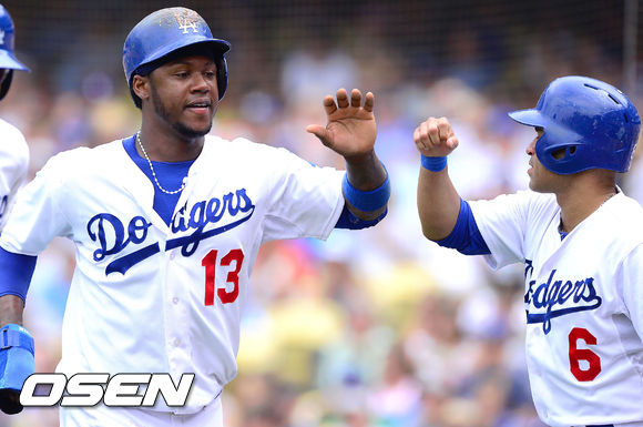 [OSEN=로스앤젤레스, 곽영래 기자] 1일(한국시간) 미국 캘리포니아주 로스앤젤레스 다저 스타디움에서 열린 2013 미국 메이저리그 LA 다저스와 필라델피아 필리스의 경기, 4회말 2사 3루 다저스 맷 켐프의 1타점 적시타때 3루 주자 라미레스가 홈을 밟은 뒤 동료들의 축하를 받고 있다.