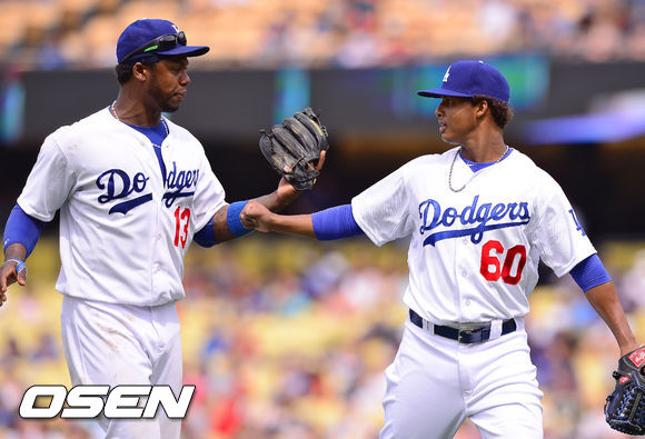 [OSEN=로스앤젤레스, 곽영래 기자] 1일(한국시간) 미국 캘리포니아주 로스앤젤레스 다저 스타디움에서 열린 2013 미국 메이저리그 LA 다저스와 필라델피아 필리스의 경기 8회초 필라델피아 세타자를 삼자범퇴로 막은 다저스 로밍게스 투수가 라미레스의 축하를 받으며 더그아웃으로 들어가고 있다. 도밍게스는 이날 메이저리그 데뷔전을 치뤘으며 최고구속 101마일을 찍었다.
