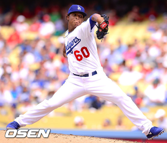 [OSEN=로스앤젤레스, 곽영래 기자] 1일(한국시간) 미국 캘리포니아주 로스앤젤레스 다저 스타디움에서 열린 2013 미국 메이저리그 LA 다저스와 필라델피아 필리스의 경기 8회초 필라델피아 세타자를 삼자범퇴로 막은 다저스 로밍게스 투수가 역투하고 있다. 도밍게스는 이날 메이저리그 데뷔전을 치뤘으며 최고구속 101마일을 찍었다.