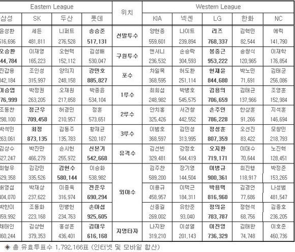 Eastern League의 투수 부문은 치열한 접전 속에 롯데 송승준이 517,131표를 획득하고 삼성 윤성환(516,696표)을 불과 435표 차로 따돌리면서 투표 3주 만에 1위에 올라섰다. Eastern League 유격수 부문 역시 롯데 신본기가 삼성 김상수(527,247표)를 끈질기게 추격한 끝에 542,668표를 얻어 1위 역전에 성공했다.