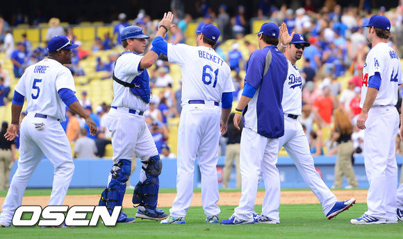 경기 종료 후 다저스 선수들이 승리의 기쁨을 나누고 있다. / soul1014@osen.co.kr