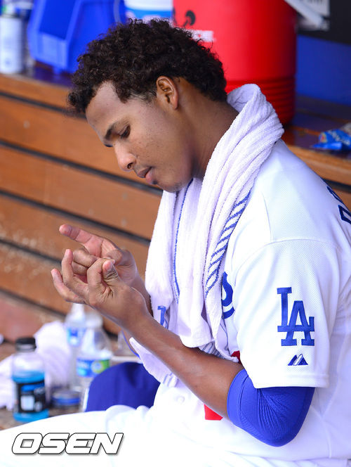 9회초 다저스 도밍게스가 더그아웃에 앉아 손톱을 정리하고 있다. / soul1014@osen.co.kr