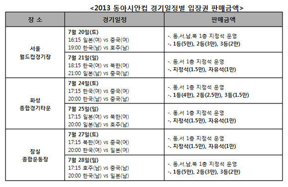 대한축구협회(회장 정몽규)는 오는 20일부터 개최되는 ‘2013 동아시안컵’의 온라인 입장권 판매를 1일부터 시작한다고 밝혔다. 2013 동아시안컵은 대표팀 사령탑 홍명보 감독이 첫 선을 내보이는 대회이기도 하다.
