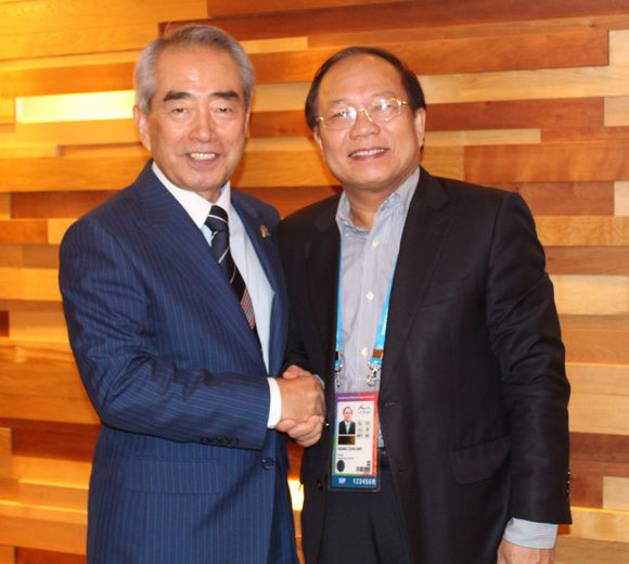 2014 인천아시아경기대회조직위원회를 방문한 베트남 황 뚜언 아인(오른쪽) 문화체육관광부 장관이 김영수 조직위원장과 함께 기념촬영에 나섰다.