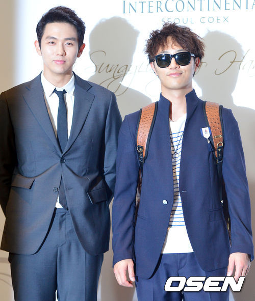 가수 임슬옹과 배우 진구가 기성용-한혜진의 결혼식에 참석해 포토타임을 갖고 있다.