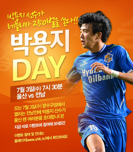 K리그 클래식 울산은 오는 3일 오후 7시 30분 문수축구경기장에서 열리는 16라운드 전남 드래곤즈와 홈경기를 ‘박용지 Day’로 정하고 팬들에게 박용지 배번과 이름이 새겨진 레플리카 유니폼 250벌을 선물한다.