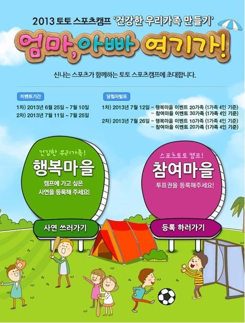 '엄마, 아빠 여기가!'라는 재미있는 타이틀의 온라인 이벤트는 캠프에 가고 싶은 사연을 등록하는 '건강한 우리가족! 행복마을'과 토토, 프로토를 구매한 후 이벤트 페이지에 영수증을 등록한 고객들을 대상으로 진행하는 '스포츠토토 캠프! 참여마을' 등 두 가지 방식으로 진행된다.