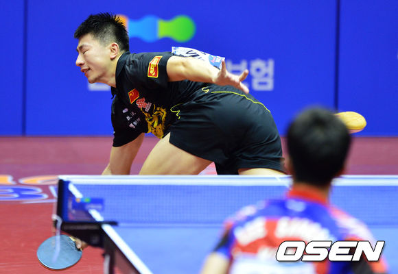 4단식에서 중국 마룽이 한국 이상수의 볼을 받기 위해 안간힘을 쓰고 있다.