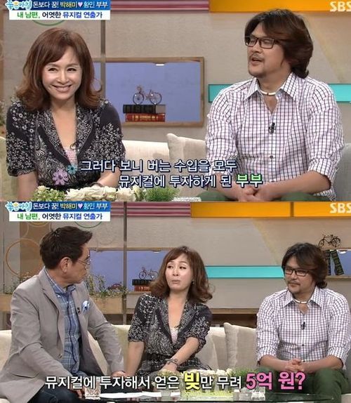 또한 박해미는 창작 뮤지컬에 대한 투자로 작년에 5억원의 빚을 지게 된 사실을 이야기했다. 그는 "지금 버는 수입을 다 뮤지컬에 투자하고 있다"면서 "작년에 생긴 빚이 5억이다. 그 빚을 엉뚱한 곳에 쓴 게 아니라 대부분 함게 일하는 사람들의 인권비로 나갔다"고 밝혔다.