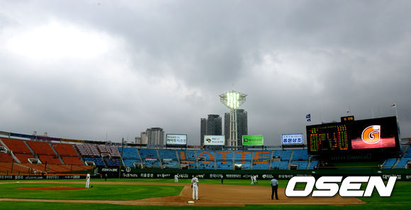 2일 오후 부산 사직구장에서 열린 롯데 자이언츠와 삼성 라이온스의 경기, 전국적으로 장맛비가 예고된 가운데 사직구장 하늘에 비 구름이 잔뜩 머물고 있다