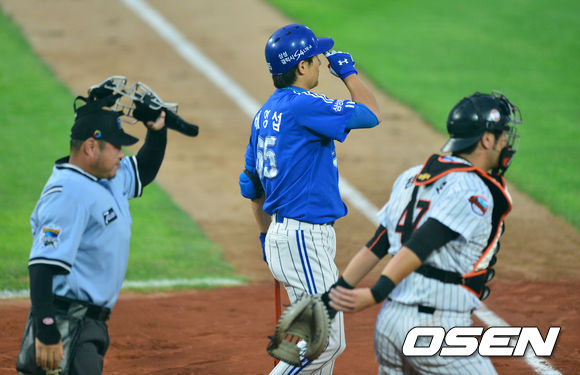 2일 오후 부산 사직구장에서 열린 롯데 자이언츠와 삼성 라이온스의 경기, 삼성 배영섭이 1회초에 이어 3회초 1사에서 삼진으로 물러나며 아쉬워하고 있다