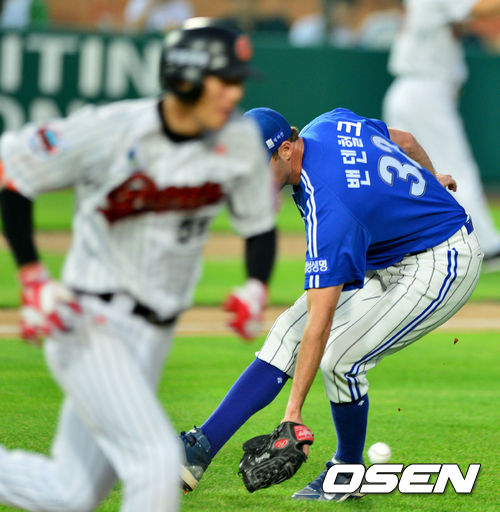 2일 오후 부산 사직구장에서 열린 롯데 자이언츠와 삼성 라이온스의 경기, 3회말 1사 2루에서 삼성 밴덴헐크가 롯데 이승화의 투수앞 땅볼 타구를 놓치고 있다.